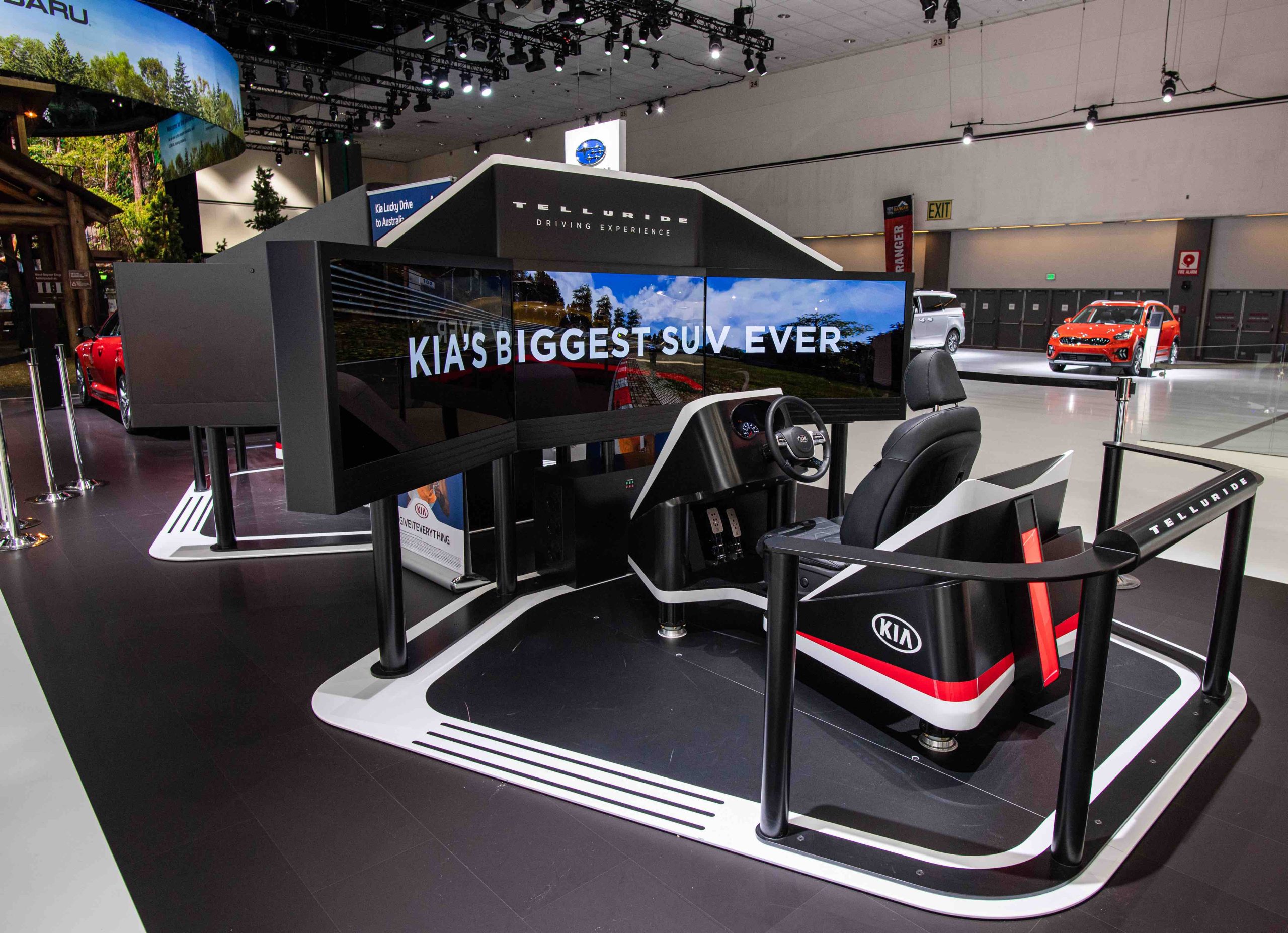 The other simulator showcased the Kia Telluride’s capabilities in a real-world off-road situation when a rock slide forces the driver into the “Kia Woodlands.”