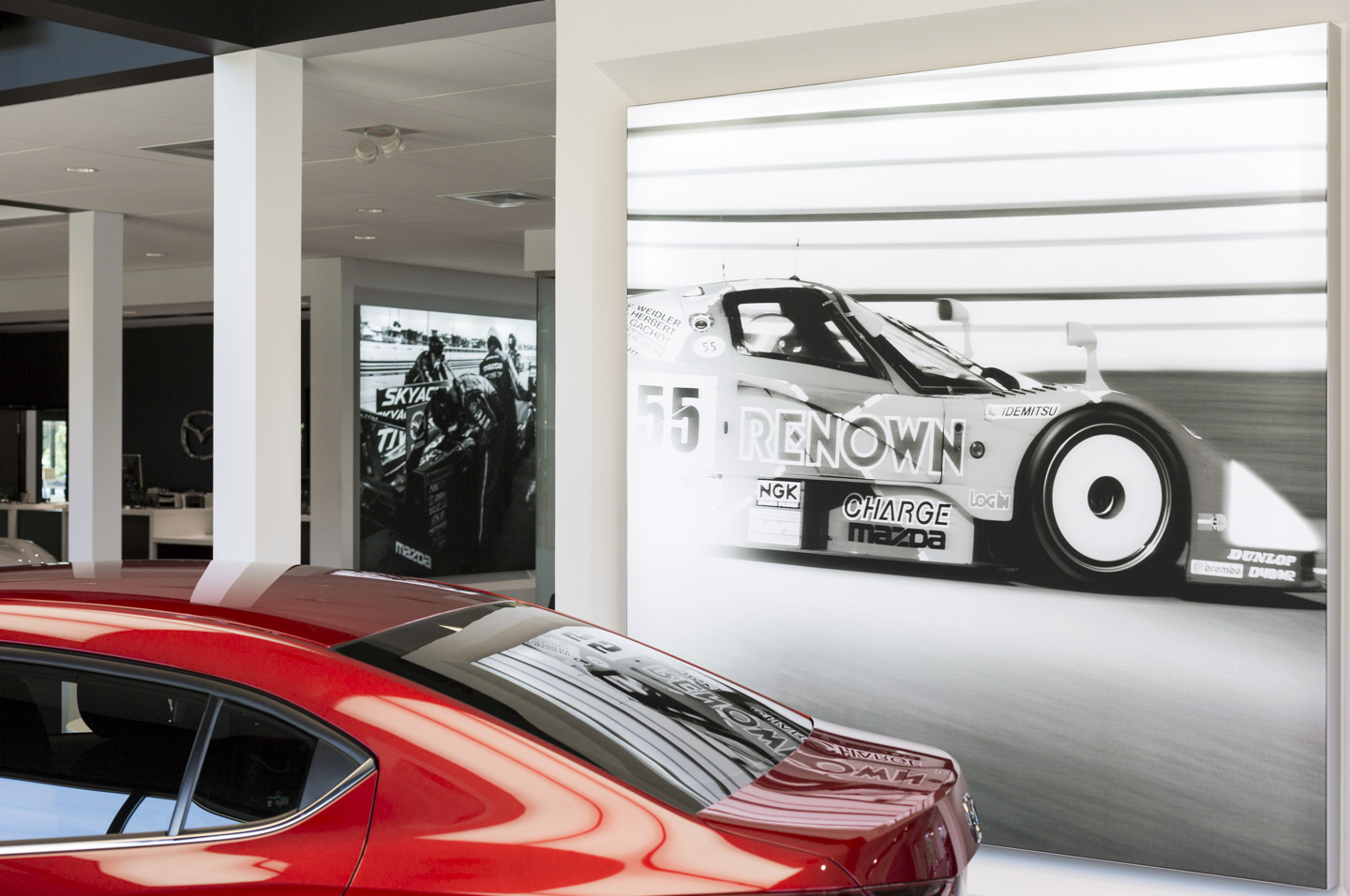 Several large-scale feature graphic prints effectively turn each dealership into an art gallery, elevating the forms of Mazda’s cars and promoting on the Mazda lifestyle.