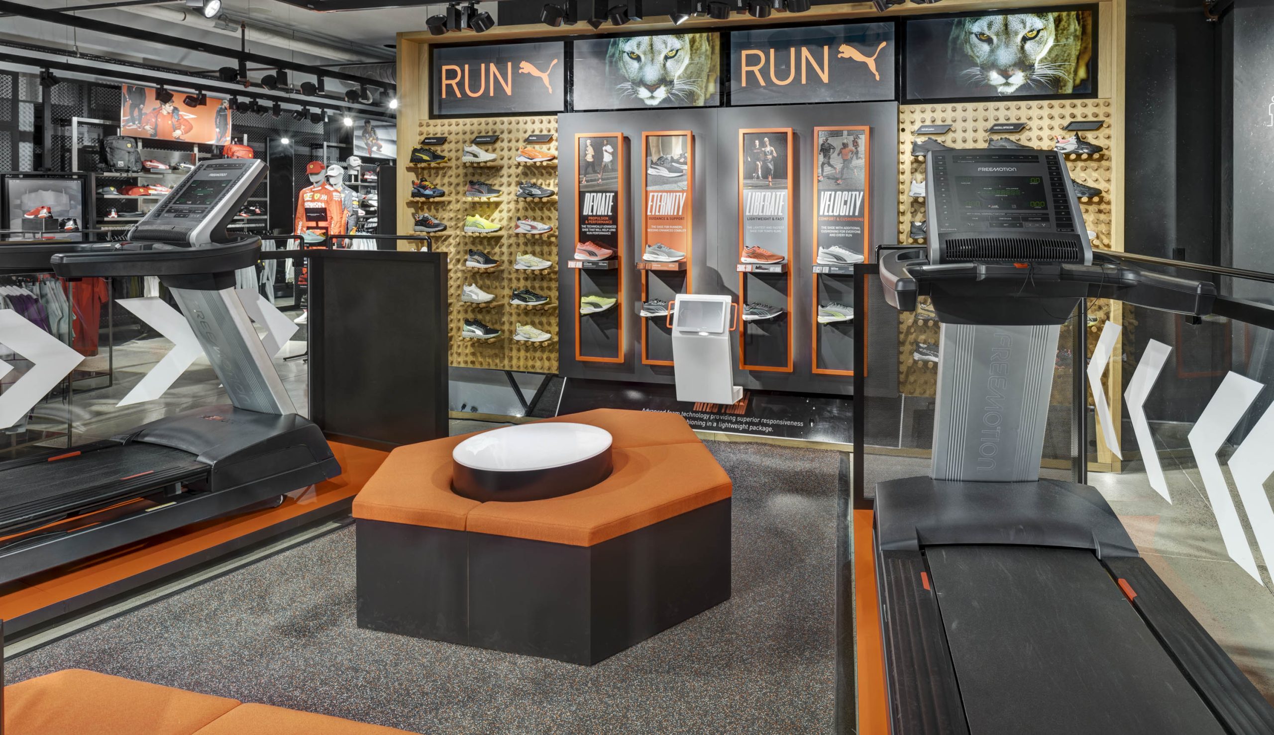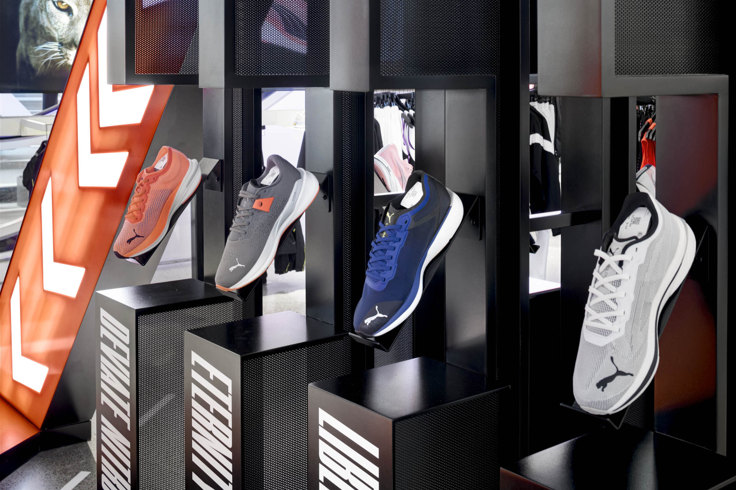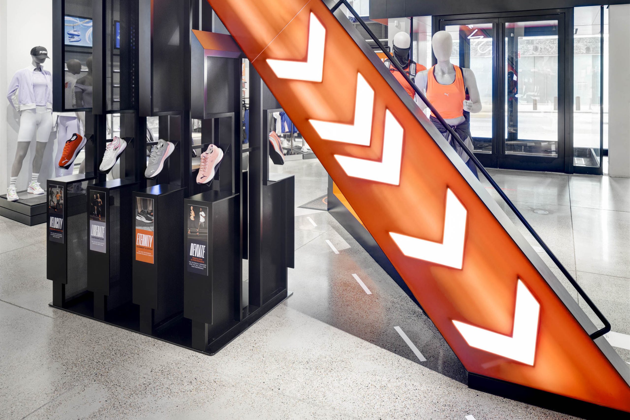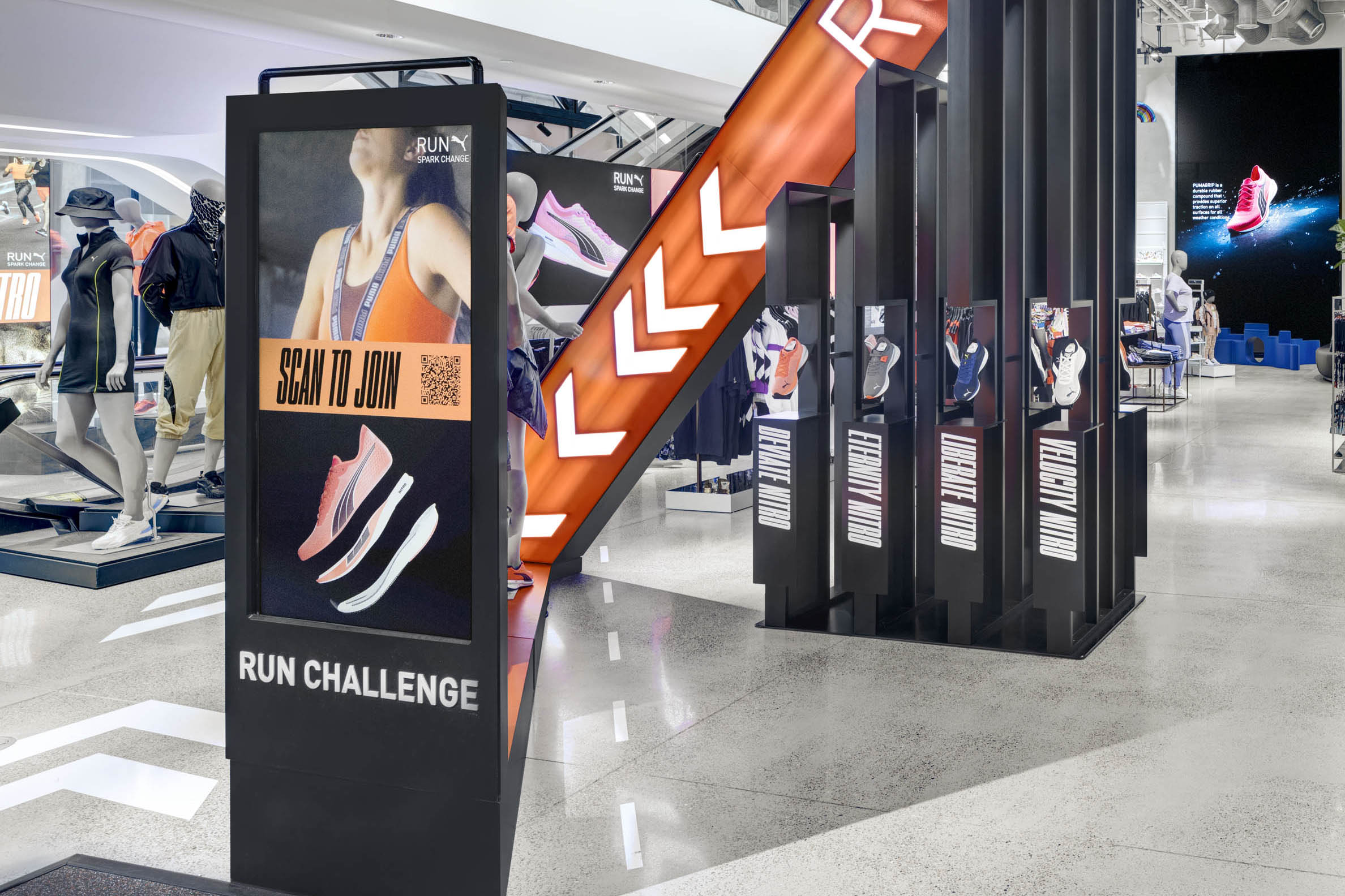 A multi-dimensional NITRO Landing Zone near the entrance of PUMA’s NYC flagship drew customers into the store. It featured large, angled LED panels with animated arrows and text — creating a sense of motion that was in line with the NITRO products.